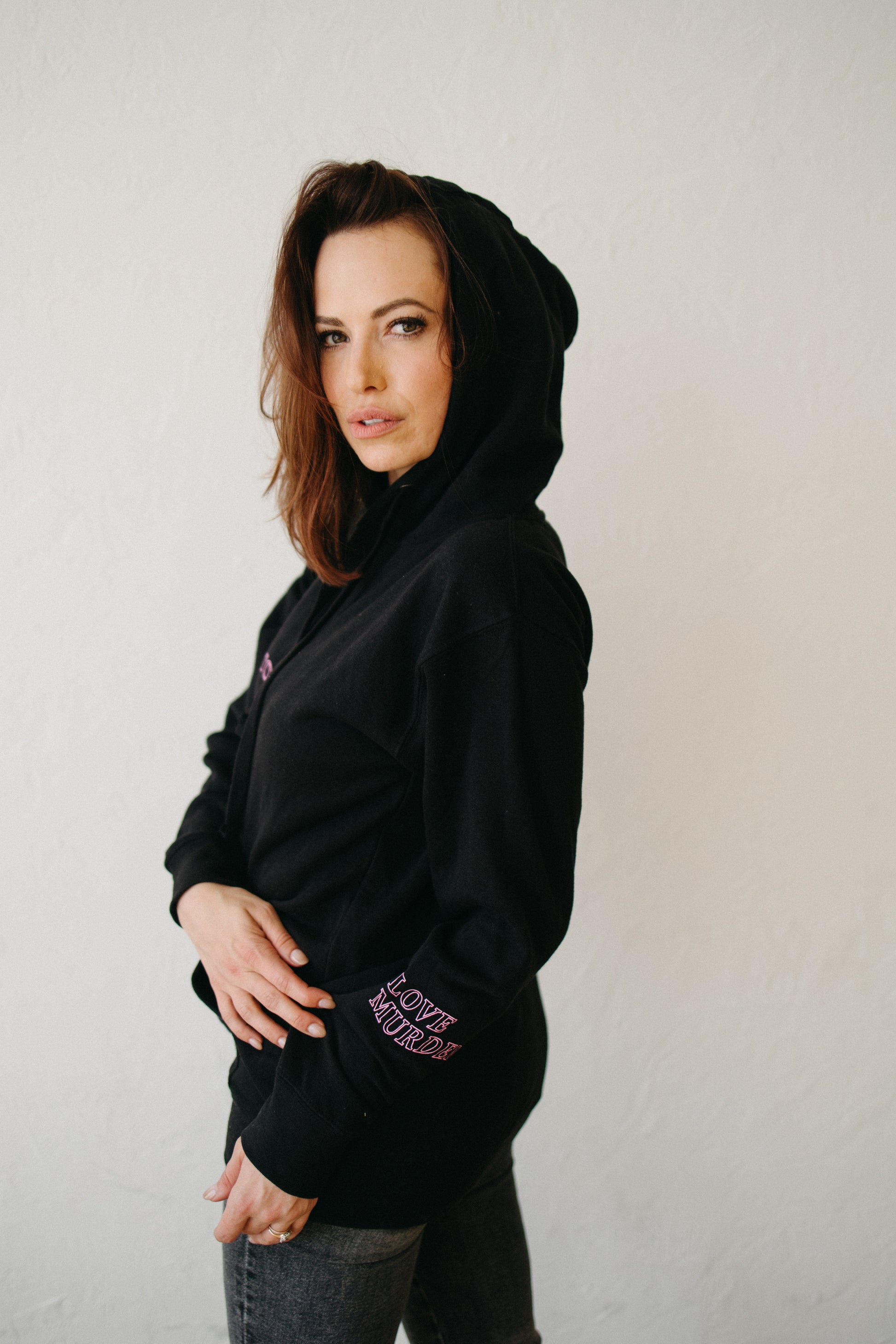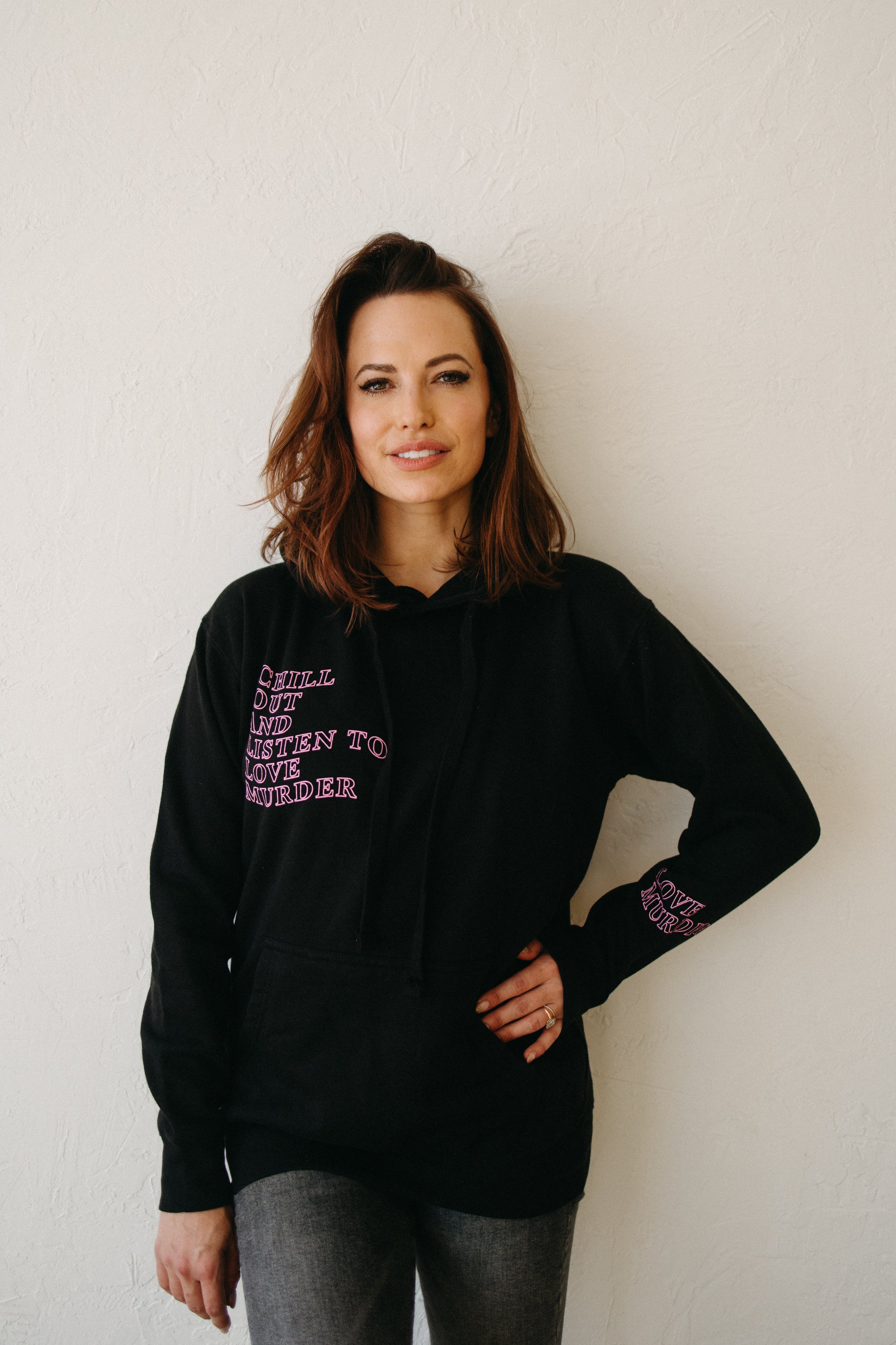 ...AND LISTEN TO LOVE MURDER in this cozy, perfect black hoodie. Made in 2022 for CrimeCon this classic is the perfect lounge or stylish hoodie.